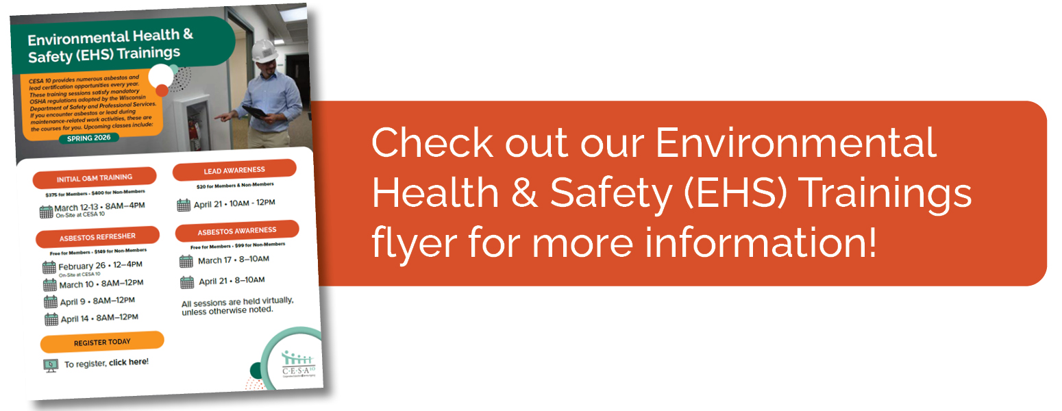 Upon request, CESA 10 can offer Asbestos O&M Initial and Designated Person training plus Chemical Safety training. To inquire about receiving training on these topics, email facilities@cesa10.k12.wi.us. A minimum of six people is needed for any training session.